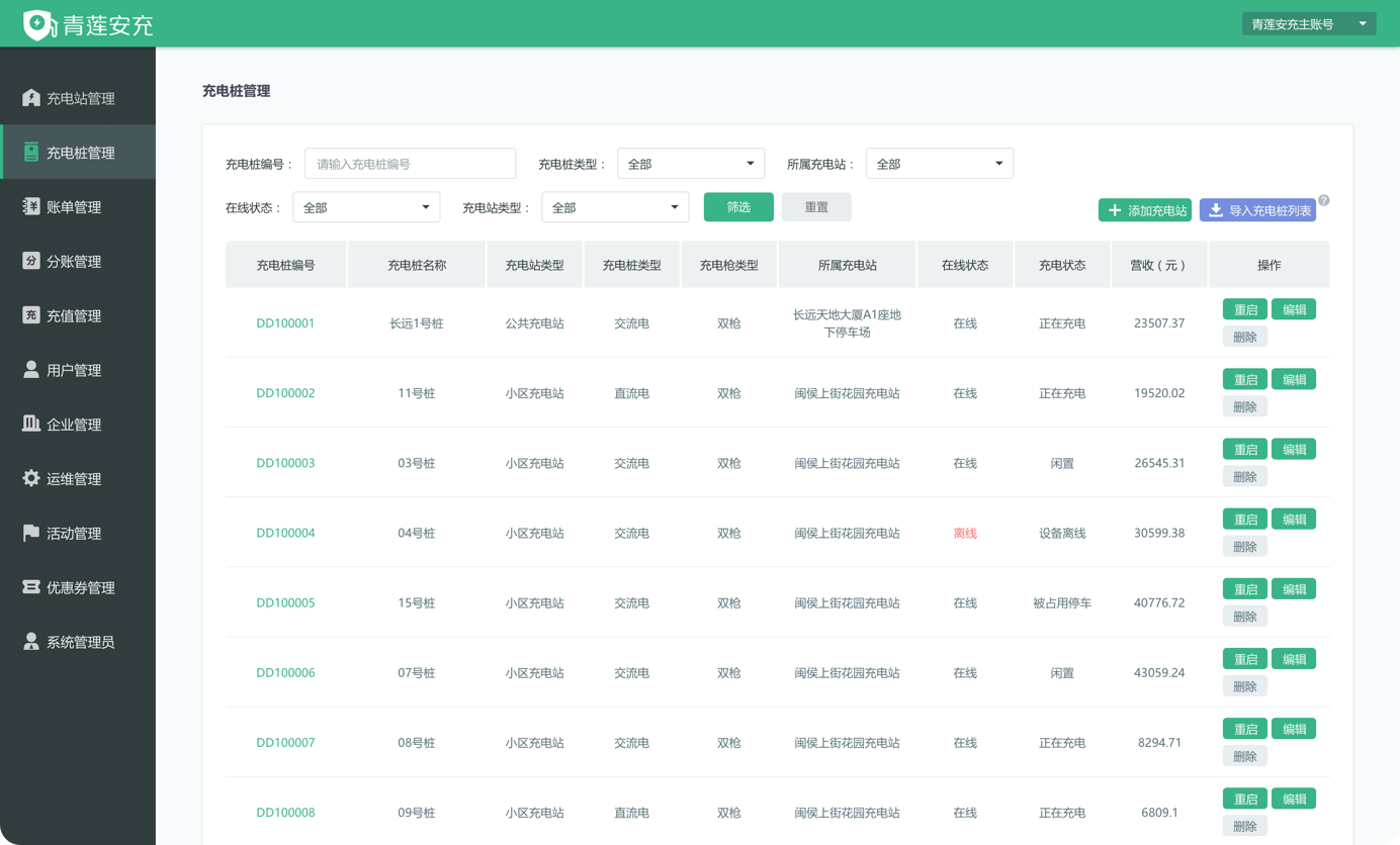 提供充电桩资产数据管理、电桩在线监控、设备故障管理、告警配置管理等。